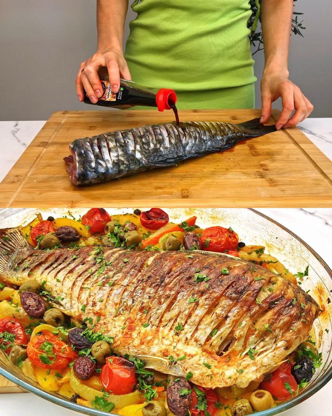 La vedette de ce plat est la carpe tendre et succulente, qui absorbe les riches saveurs de la marinade et se marie bien avec la douceur naturelle des légumes rôtis. Ce repas est non seulement délicieux, mais il est également sain, regorgeant de nutriments essentiels provenant du poisson et de la gamme colorée de légumes.